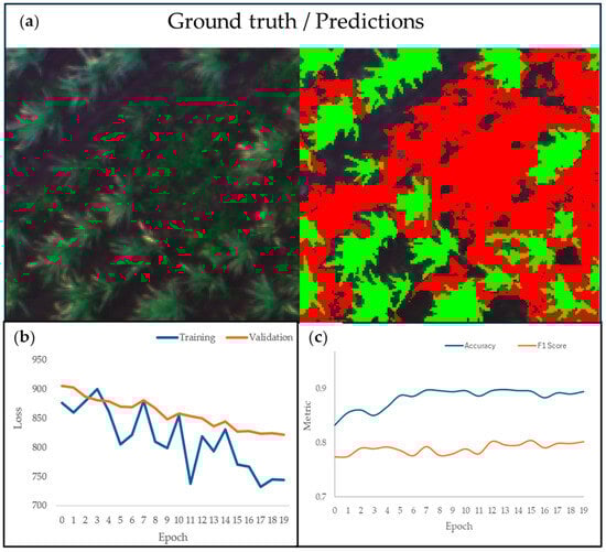 These differences were taken into account when applying the DL algorithm. For instance, Figure 5a shows a sample image and how the algorithm detected sugarcane and weeds at the training stage. The area corresponds to one training tile. Figure 5b shows the optimal values of the DL model’s loss function for a training set and its cross-validation. The training and validation loss curves consistently decreased across epochs, indicating that the model was learning effectively without overfitting. The model reached an optimal level of convergence after epoch 13, as both curves seemed stabilized, suggesting that further training yielded minimal improvements only. Figure 5c also shows the accuracy and F1 score, explaining the model’s reliability after training. The overall accuracy of 87% demonstrated the model’s suitability for classification.