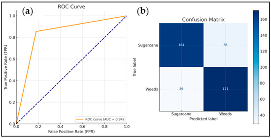 The true positive rate (TPR) is the proportion of the correctly classified samples, and the false positive rate (FPR) is the proportion of the incorrectly classified samples [40]. The ROC curve is a visual representation of the model performance and is drawn by calculating TPR and FPR at every possible threshold. Area Under the Curve (AOC) represents the binary classification model’s ability to separate classes and ranges from 1 to 0 [40]. Figure 6a shows an AUC of 0.84, highlighting the model’s strong performance. Figure 6b displays the confusion matrix, revealing a large number of correct predictions but also showing some misclassifications between “sugarcane” and “weeds”. These results indicate that the model is adequate.