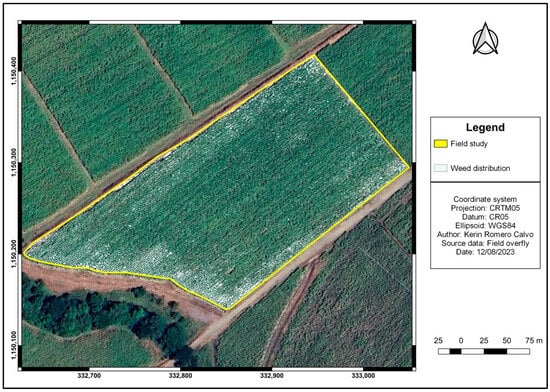 In precision agriculture, VRA refers to applying input doses such as herbicides or fertilizers based on the precise location or specific condition of the area where input is being applied [16]. Hence, the technique is based on the understanding that different areas within a field may require different amounts of these inputs due to variability in soil conditions, crop needs, and environmental factors [16]. VRA integrates precision tools, remote sensors, and Global Navigation Satellite Systems (GNSS) for real-time field assessment of weed concentrations and prescription maps to adjust herbicide dosages as the equipment moves through the field [17]. By leveraging VRA in site-specific farming, farmers can optimize input usage, improve yields, and make their practices more sustainable. For example, optimizing herbicide application rates through VRA significantly reduces herbicide usage, operational costs, and environmental impact and enhances the yield while maximizing herbicide efficacy [18]. There are two types of VRAs: map-based and sensor-based [19]. The map-based VRA system guides the variable rate application with reference to pre-loaded prescription maps. These prescription maps are site-specific and vary with the soil type, crop, irrigation, and other environmental factors [19]. Therefore, they can only be used for the area where they were designed. When developing weed-controlling prescription maps, weed types should identify and measure their spatial and volumetric densification for a more accurate weed assessment [19]. The accuracy of the derived information is crucial as it directly influences the herbicide type, quantity, and total volume of the mixture in the prescription. To the authors’ knowledge, no sugarcane prescription maps have been developed using a map-based VRA system in Costa Rica. However, there is a demand for developing a regionally customized weed detection method using remote sensing and site-specific variable rate and map-based prescriptions for weed control.