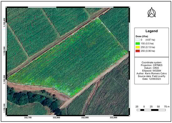 Once the weed areas were extracted, they were intersected with CHM to obtain each weed patch’s volume and average height. Weed density was also calculated. Based on this information, weeds were classified into three categories. Subsequently, a VRA recommendation was generated for each class, adjusting the herbicide dose according to the weed density in each area. The dosage adjustment process followed a general management strategy, with taller and denser weeds requiring a higher herbicide concentration. In contrast, zones with lower weed density and shorter height require less product [39].