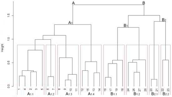 Hierarchical clustering of phytosociological relevés from the Ruwenzori Mountains (Uganda). The cophenetic correlation coefficient was 0.734. A. Dendrosenecionetalia erici-rosenii; A1. Dendrosenecionion erici-rosenii; A1.1. Galio ruwenzoriensis-Dendrosenecionetum erici-rosenii; A1.2. Alchemilletum argyphyllae; A1.3. Helichrysetum stuhlmannii; A1.4. Erico trimerae-Hypericetum bequaertii; B. Dendrosenecionetalia adnivalis; B1. Dendrosenecionion adnivalis; B1.1. Lobelio wollastonii-Dendrosenecionetum adnivalis; B1.2. Caricetum runssoroensis; B2. Alchemillion stuhlmannii; B2.1. Alchemilletum subnivalis; B2.2. Senecio mattirolii-Sedetum ruwenzoriensis.
