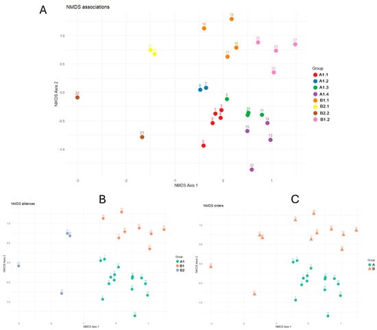 Non−metric multidimensional scaling (NMDS) of the phytosociological relevés (stress value = 0.14). (A). Associations; (B). alliances; (C). orders. For the legend of the syntaxa, see Figure 2.