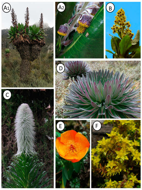 - Brochmann, C.; Gizaw, A.; Chala, D.; Kandziora, M.; Eilu, G.; Popp, M.; Pirie, M.B.; Gehrke, B. History and evolution of the afroalpine flora: In the footsteps of Olov Hedberg. Alp. Bot. 2022, 132, 65–87. [Google Scholar] [CrossRef]
