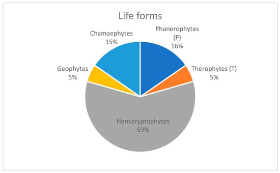 List of taxa surveyed in the phytosociological study. The following abbreviations are used for life forms: G = Geophyte; H = Hemicryptophyte; Ch = Chamaephyte; P = Phanerophyte; T = Phanerophyte.