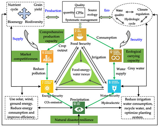 The CPS is a multifunctional system that encompasses a range of functions, including production, ecological, supply, and safety functions. In this context, the study of the FEW nexus can be more fully understood. To this end, it is necessary to establish a system framework that can reveal the fundamental basis of the research, and this study represents an important aspect of that framework. It is imperative that food CPSs meet the current demand for food in terms of quantity, quality, source, and management. In order to achieve the requisite quantities, CPSs must also give priority to the following factors: crop yields, soil nutrient cycling, biodiversity, and bioenergy use. Furthermore, it is essential to consider the impact of climate regulation, water resource quality, and the hydro-electric energy cycle on the ecological integrity of CPSs [63]. The water resources system is comprised of two categories of water: green water and blue water. Green water is defined as surface water and groundwater derived from precipitation and snow that is directly absorbed by the root system of the crop. Blue water, on the other hand, is derived from the same source as green water but is obtained through irrigation. Further details are presented in Figure 1.