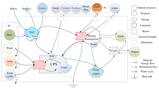 Emergy analysis has been extensively employed in CPSs and has proven to be an efficacious methodology for evaluating the FEW nexus [69]. Figure 2 illustrates the nodes representing elements within the CPS, with arcs between nodes representing exchange relationships involving materials, energy, and information. The study of ecological network models provides a foundation for understanding ecological flow dynamics. CPSs require careful management to ensure their sustainability [70].