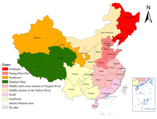 Taking into account factors such as the carrying capacity of agricultural resources, environmental capacity, ecological types, and development bases of various regions, the National Plan for Sustainable Agricultural Development (2015–2030) divides the country into three major regions, including optimized development zones, moderately developed zones, and protected development zones. This allows for the implementation of tailored policies, promotion in a stepwise manner, and classification according to the aforementioned factors. Some provinces are distributed across the aforementioned development zones; the study area has been divided into eight zones in conjunction with the economic development zones, as illustrated in Figure 3. For a comprehensive list of the provinces included in each zone, please refer to Table S5 in the Supplementary Materials.