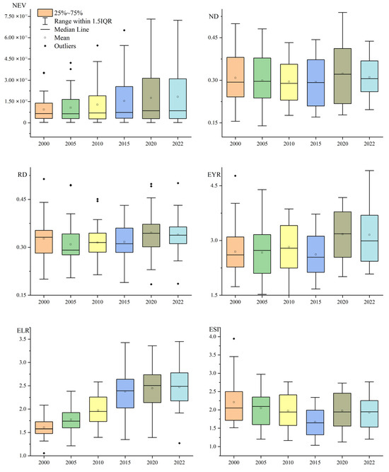 Among the stability indicators, the distributions of NEV in different years are skewed, but with similar median values. This indicates that the distribution of NEV values across provinces is becoming more dispersed, while the diversity of crop production across provinces is also increasing. In 2000, as indicated by the CPSs emergy evaluation indicators, there is a greater degree of concentration than in the later years. While there is a single outlier, the overall aggregation of NEVs in each province remains relatively consistent. Additionally, the median and mean values are observed to be relatively close to each other. The dispersion of the NEV value increases as the year progresses, with 2020 NEV representing a peak value. The aggregation of ND between years is more balanced, with relatively small differences between years. The highest variance is observed in 2020, with a subsequent concentration in 2022.