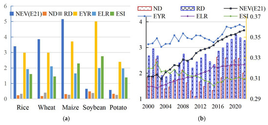 Emergy evaluation index. (a) Emergy evaluation index for five crops. (b) Changes of emergy evaluation index. Notes: Figure 5b presents a line graph on the left Y primary axis and a bar graph on the right Y secondary axis.