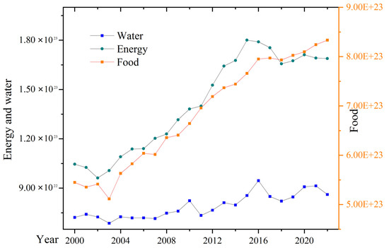 Having conducted an analysis of the evolution of food in the CPS, it is now necessary to analyze the FEW Nexus. In the CPS, food production is the output, and energy and water are the emergy inputs to food production. The annual total emergy for the study period was calculated to be 6.85 × 1023 Sej for food resources, 1.43 × 1023 Sej for energy resources, and 7.91 × 1022 Sej for water resources. The annual growth rates were found to be 2.16%, 2.11%, and 0.77%, respectively. These findings are illustrated in Figure 6. Of these, energy and water accounted for 21.68% and 11.55% of food, respectively. The CPS food output is represented by food. Energy includes renewable energy and purchased fuel-based and clean energy, and water includes green and blue water. In the context of the CPS, the growth of single resources is fastest for food resources, followed by faster growth in energy resources input and slower growth in water utilization. Since 2015, purchased energy input has shown a downward trend, and, similarly, water resources have started to show S-shaped fluctuations since 2016.