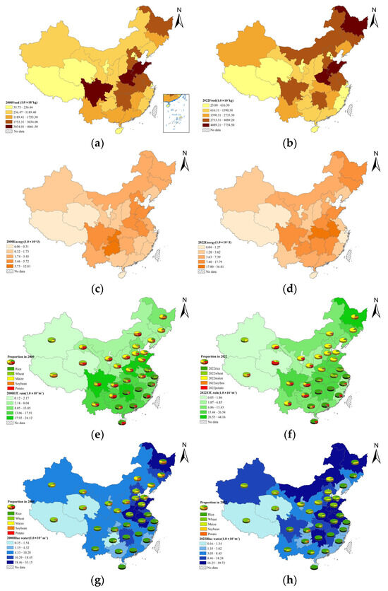 Emergy accounting for food, purchased energy, blue and green water resources, and the share of different crops. (a) Food resources in 2000. (b) Food resources in 2022. (c) Purchased energy resources in 2000. (d) Purchased energy resources in 2022. (e) Green water resources in 2000. (f) Green water resources in 2022. (g) Blue water resources in 2000. (h) Blue water resources in 2022.