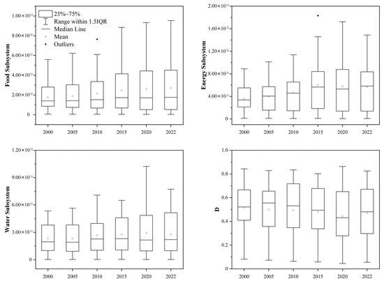 While the growth in water inputs was relatively modest, the interprovincial growth was more uniform than that observed in the food and energy sectors. As illustrated in Figure 8, a comparison of the data distribution among provinces reveals that the food subsystem exhibits a right-skewed normal distribution, with the upper whisker becoming increasingly elongated. However, all are positively skewed, indicating an overall positive development trend. There is a discrepancy between the supply and demand of food in China’s diverse provinces [84]. The energy subsystem primarily reflects alterations in natural renewable resources, and the energy inputs in each province demonstrate a shift from aggregated to dispersed distribution. The upper whisker reached its longest point in 2015 and subsequently declined, which is associated with the greening of China’s energy resources and the imminent restructuring of its energy resource structure [12]. The distribution of the energy subsystem shifts from right-skewed to left-skewed. Similarly, the water subsystem exhibits a right-skewed, normal distribution. The regional distribution of water resources is uneven, with a mean value that is larger than the median. This suggests that the provinces with high values of water input are unusually large, exerting a significant influence on the overall average [55]. The year 2020 was distinguished by elevated temperatures, precipitation, and flooding in select regions, with the upper whisker of the year exhibiting a notable length. The D-values exhibited a left-normal distribution with negative skewness in 2000, a right-normal distribution with negative skewness in 2005, and a right-normal distribution with positive skewness by 2020.