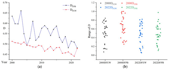 The D value of FPB nexus in comparison to the FEW nexus in select years. (a) D value. (b) D value of FPB nexus and FEW nexus.