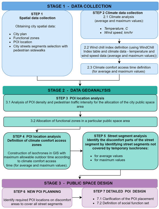 First of all, it is the allocation of the boundaries of the public space of the city for its development. Its boundaries may not coincide with the boundaries of the existing city center but expand depending on the location of existing facilities, not only in the public and business part of the city but also in adjacent residential areas. In this way, the interests of the residents are taken into account and their connection to the public functions of the city through pedestrian mobility takes place. The second task is to analyze the density of the location of social functions for different user groups. To identify problem areas, the principle of climatic comfort is used, which determines the conditions of comfortable access to the point of interest. If a problem is identified, a decision is made about the need to place additional points of interest on the identified street sections. The third task determines a reasonable choice of spatial planning solutions for the development of the urban environment: reconstruction of the pedestrian spaces of streets, redevelopment of adjacent developments or new construction. The proposed approach has scientific and practical novelty in terms of solving the problem of climatic comfortability through the formation of linear public spaces with a given density of social facilities.