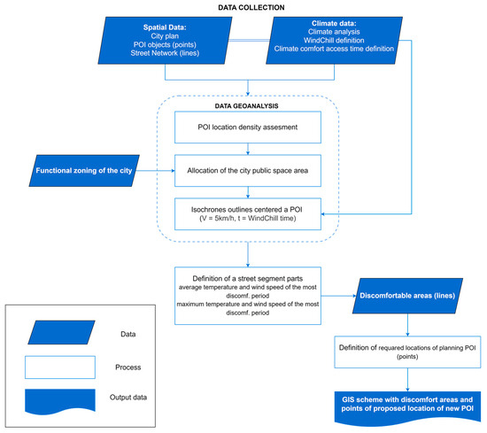 The issue of forming a comfortable environment in cities with complex climatic conditions has always been an urgent and difficult issue for urban planners. Cities located in the territories of the Far North are characterized by extremely harsh climatic characteristics that affect the planning solutions for the public spaces of the city. Low temperatures and strong winds reduce the time of comfortable stay in the open air, which leads to a decrease in the mobility of the population in the city and stimulates the use of personal cars. The research question is the rational placement of points of interest on the street network to ensure a comfortable travel time between objects. The research methodology of public space planning taking into account the climatic comfortability of Far North cities is proposed in this article. Also, an automated GIS-based algorithm for determining intermediate points on linear objects to increase POIs’ connectivity for the development of the public space of Far North cities under the condition of organizing climatic comfort is proposed. Development of safe and comfortable public space on the basis of network accessibility, taking into account the difficult climatic conditions of these cities, will increase the social activity of the population and tourists, as well as promote economic growth and business development in the city.