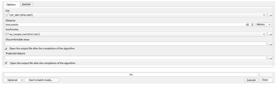 The developed script for QGIS is also used to determine intermediate points. First, we determine intermediate points for the isochrones for the average climatic parameters. As input data, we choose the previously obtained (lines) and temporary isochrones (polygons). As the required distance, we input the distance determined through the temporal isochrones for the climatic parameters. The distance of 2000 m is chosen for the average climatic parameters. As a result of the script, we obtain a proposal to place intermediate objects on discomfort areas to increase the connectivity and, as a consequence, the comfort and safety of the public space (Figure 19).