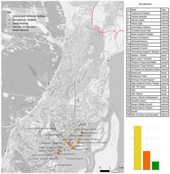 This study has demonstrated that further research could include additional studies of the public transport network to analyze the density and connectivity of POIs within the boundaries of more than 5 km. This is especially true for natural sites located on the periphery of the city, which can only be reached by motorized transport. This will require additional analysis of the city’s transport infrastructure and public transportation routes. Also, as further research, it is possible to study other parameters affecting the connectivity of the POIs of the Far North cities (landscape of the city, daylight duration, saturation of cultural and consumer service facilities, transport infrastructure, availability of navigational objects).