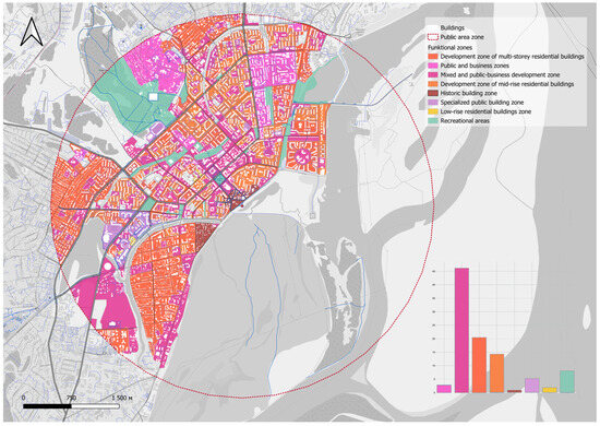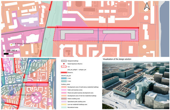In order to develop the public space, taking into account comfort in the studied territory, it is necessary to compare the existing functional zoning scheme and sites with the points of intermediate objects’ placement. A mixed and public–business development zone is selected as a project proposal in the city of Yakutsk (Figure 21).