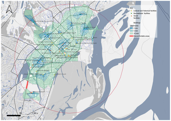 In accordance with the next step of the developed methodology, it is necessary to construct time isochrones in accordance with the defined limiting time of being on the street for traveling between POIs. As input data, we take the linear objects of the street network and the allowable travel time defined earlier by climate data and the WindChill Index. For the average values of the temperature and wind speed, we take isochrones with a travel time of 10 min for the maximum parameters 2–5 min.