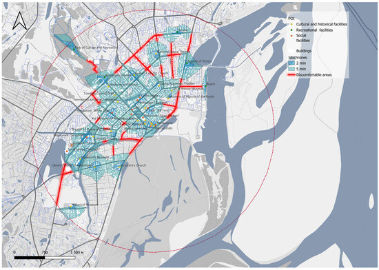 The research conducted within the framework of this article has shown that there is indeed a problem with POIs’ connectivity and public area comfort in northern cities. Based on the example of Yakutsk city, discomfort areas were identified not only on the periphery of the public area but even in the city center (at the maximum climatic parameters).