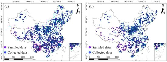 Distribution of sample values of soil carbon density in soil layers at 0–20 cm (a) and 0–100 cm (b) depths. Sampled data refer to the soil data obtained from our project team’s field survey. Collected data refer to the collection of data from the literature and databases.