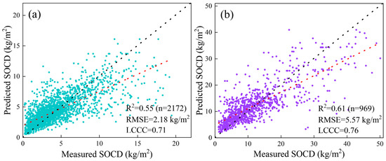 Scatter plots of estimated and predicted SOCD values: depths of 0–20 cm (a) and 0–100 cm (b). R2, coefficient of determination; RMSE, root mean squared error; LCCC, Lin’s concordance correlation coefficient.