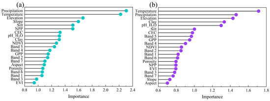 Order of importance of ECs used to predict SOCD in random forest: depths of 0–20 cm (a) and 0–100 cm (b).