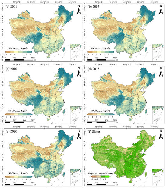 Spatial distribution of and temporal variation in 0–20 cm SOCD. (a–e) represent SOCD distribution maps; (f) shows the change in SOCD. When slope > 0, the SOCD of the time series shows an increasing trend; when slope < 0, the SOCD of the time series shows a decreasing trend.