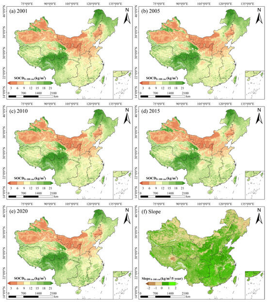 Spatial distribution of and temporal variation in 0–100 cm SOCD. (a–e) represent SOCD spatial distribution; (f) shows the change in SOCD. When slope > 0, the SOCD of the time series shows an increasing trend; when slope < 0, the SOCD of the time series shows a decreasing trend.