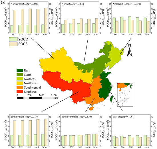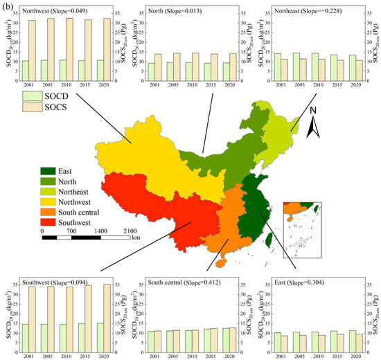 From 2001 to 2020, the variation range of China’s 0–20 cm depth SOCS was 38.11~41.12 Pg C, and that of the 0–100 cm depth was 110.49~114.96 Pg C (Figure 6). From 2001 to 2020, the slopes of the mean Theil–Sen median values for the 0–20 cm and 0–100 cm depths in the northwest, southwest, south-central, north, and east regions were all positive, and the SOCD showed an increasing trend, while those in the northeast were negative, and the SOCD showed a decreasing trend (Figure 6).