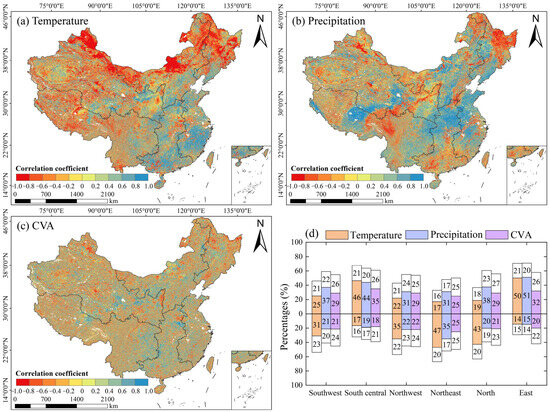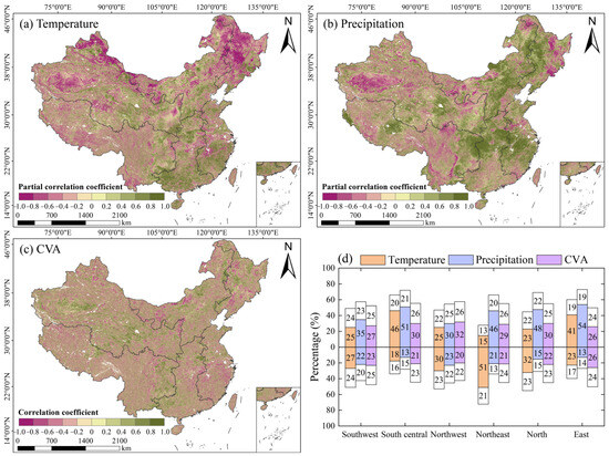 Spatial pattern of partial correlation and correlation coefficients of SOCD at a depth between 0 and 20 cm and influencing factors from 2001 to 2020. These factors include temperature (a), precipitation (b), land use disturbance intensity (c), and (d) the percentage of partial correlation and correlation between SOCD at a 0 to 20 cm depth and the three influencing factors. Upward and downward bars indicate percentages of positive and negative correlation, respectively. Colored areas indicate correlation coefficients greater than 0.5 or less than −0.5.