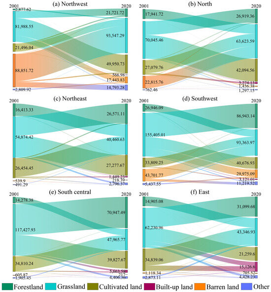 To further understand the land use changes in each region, we also conducted a land use transfer matrix analysis (Figure 9). The results show that over the past 20 years, land use change has generally been a mutual shift between forest land and grassland, and between cultivated land and grassland, with the grassland⟶forestland shift area being much higher than that of the forest land⟶grassland shift in all regions; however, in the northwest and north regions, the cultivated land⟶grassland shift area is significantly higher than that of the grassland⟶cultivated land shift. In addition, the barren land⟶grassland shift area is much higher than that of barren land⟶grassland in the northwest and north, and the expansion of built-up land in the east region is more obvious than in other regions.