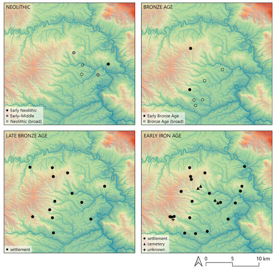 Site distribution in study area during prehistory and Early Iron Age. Elevation values are same as in Figure 1.