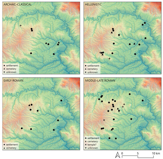 The Archaic and Classical periods are represented by few sites, none of which was from a single period. Instead, the sites from these periods were typically recovered in areas with pre-existing activity. The Hellenistic period witnessed a notable increase in site numbers. By far the largest settlements during this period were the hill sites of Ayios Petros and Ayios Nikolaos, extending over an area of c. 9.1 and 7.1 ha, respectively. The common recovery of rooftiles, table wares, storage vessels, and loomweights point primarily to the domestic use of these spaces [68,69]. On the other hand, the discovery of stone inscriptions in the same area of Ayios Nikolaos, the oldest of which is dated to the Hellenistic period, implies the existence of a public or religious context [36].
