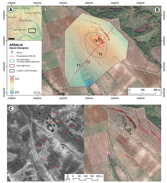 (A) A topographic map of Arsalia in relation to the other Roman sites identified in the vicinity of Ayios Georgios; the elevation values are the same as in Figure 1. (B) A Digital Elevation Model (DEM) of Arsalia overlayed onto satellite imagery with 3 m contour lines and the location of the studied test pits. The red line represents the topographical profile elaborated on in Figure 11b, while the blue dashed line marks the approximate extent of the site during antiquity. (C) The remnants of lynchet-like terracing based on the tree hedges (red arrows) in Arsalia, as noted in the 1968 pre-reclamation aerial series (left); the same marks as red lines superimposed onto the present field system of the area (right).