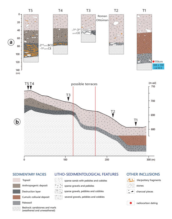 Five test pits (T1–T5), approximately 2 × 1 m each, were distributed along a NE-SW transect, extending from the highest part of the ridge (T4 and T5), to the footslopes (T3 and T2), and finally to the valley bottom (T1) (Figure 11). In T5 and T4, archaeological levels were found directly above the bedrock and included an accumulation of large tile fragments, mostly horizontally deposited, with building materials (plasters and small blocks of stones), pottery, charcoals, and ash. This unit was interpreted as a ‘destruction layer’, although in situ constructions (e.g., walls) were not found. In T5, a collected sample of pottery and glass indicated a Late Hellenistic–ER dating of the deposit (c. 2nd century BCE–1st century CE). In T3, on the upper slopes, a wall belonging to a linear structure, likely having a domestic context, was excavated in contact with the bedrock, and had a few materials dated to the Roman period (c. 2nd–4th centuries CE).