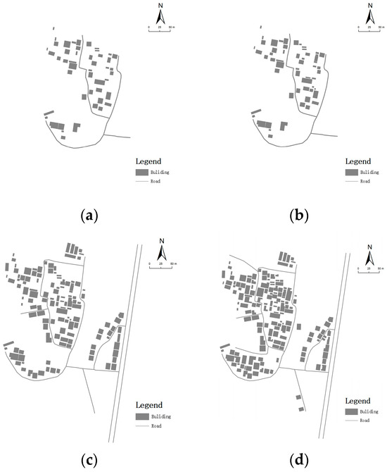 Distribution of buildings in Puqian Village across different years: (a) 1978; (b) 1985; (c) 2003; (d) 2022.