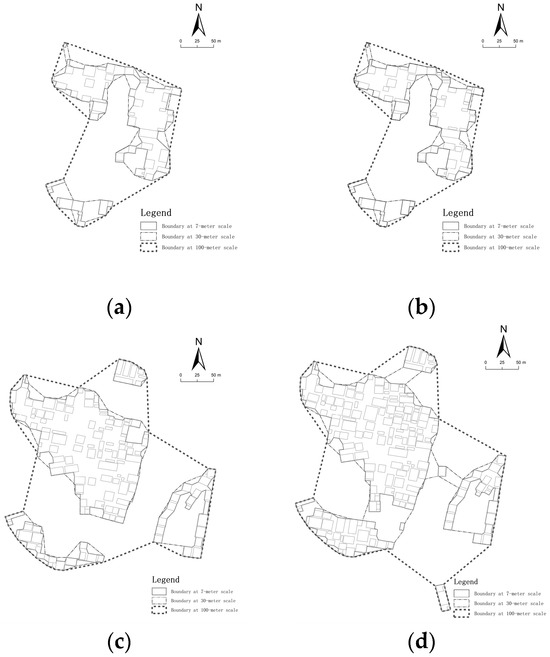 Since the individual building units are separated, the village boundary consists of both the solid boundaries of the building units and the imaginary boundaries between them. These imaginary boundaries were constructed by connecting the corner vertices of the building units at the village’s edge, creating a continuous planar enclosure together with the solid boundaries. These imaginary boundaries can be delineated at varying scales, such as 100 m, 30 m, or 7 m, depending on the spatial context [26].