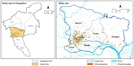 The list of old communities in this study was obtained from the Guangzhou Municipal Housing and Urban–Rural Development Bureau. Then we refined and identified 1096 old communities within central Guangzhou by comparing and correcting satellite imagery, data from the Third National Land Use Survey and building outline data. These old communities cover a land area of 26 square kilometers within the 933 square kilometers of the central city, with a total building area of 67.6 million square meters and a population of approximately 1.4 million residents (Figure 1).