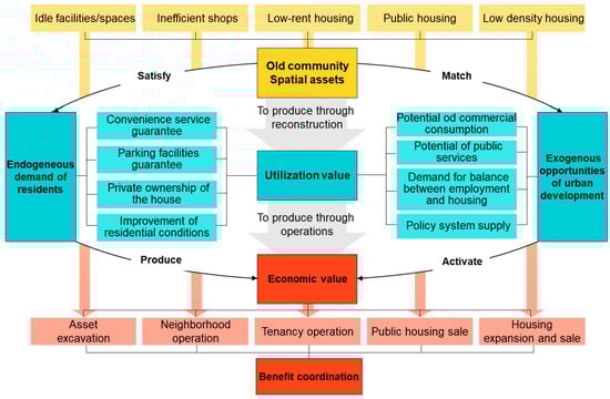 The reuse of spatial assets in old communities can enhance their economic value by leveraging the potential of use value while addressing both endogenous needs and exogenous opportunities (Figure 2). Endogenously, transforming inefficient spatial assets can address facility shortfalls, catering to diverse needs within the community, such as convenience services, parking and leisure facilities. This transformation can generate economic benefits through facility operation, environmental maintenance and community services. For instance, public housing units can be sold to residents, transferring ownership to the private sector, or expanded to improve living conditions. Fees can be charged to residents during the regeneration process []. Externally, the urban environment surrounding old communities influences how spatial assets are utilized []. For example, communities near office areas often experience a higher rental demand from working individuals, while street shops near tourist attractions typically perform better []. Thus, regeneration efforts should capitalize on the influence of nearby facilities such as industrial zones, commercial centers and subway stations to address residents’ needs for a work–life balance and commercial services [].