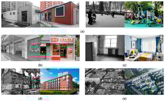 Cases before and after regeneration of five approaches to tap the economic value of spatial assets in China. (a) asset excavation—Beijing’s Jinsong Community; (b) neighborhood operation—Guangzhou’s Liuyun Community; (c) tenancy operation—Beijing’s Zhenwumiao Community; (d) public housing sale—Beijing’s Guangminglou 17; (e) housing expansion and sale—Hangzhou’s Zhegong New Village [,,,,].