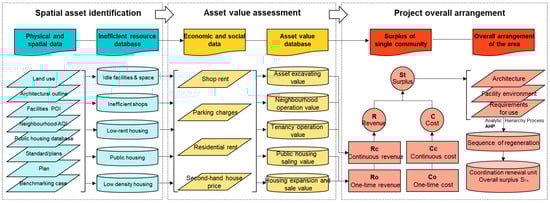 This study introduces an integrated analysis framework for multi-source data concerning the regeneration of old communities in central Guangzhou (Figure 4). The framework begins by classifying and identifying spatial assets using data from land use, Points of Interest (POI), building outlines, and relevant urban planning standards. Next, the value potential of inefficient spatial assets is assessed using a market comparison method, which involves determining the asset value by comparing similar cases and referencing comprehensive data such as rent and property prices. Finally, the “cost-revenue” analysis of regeneration funds for each community is performed to propose a coordinated regeneration plan, including the prioritization of projects.