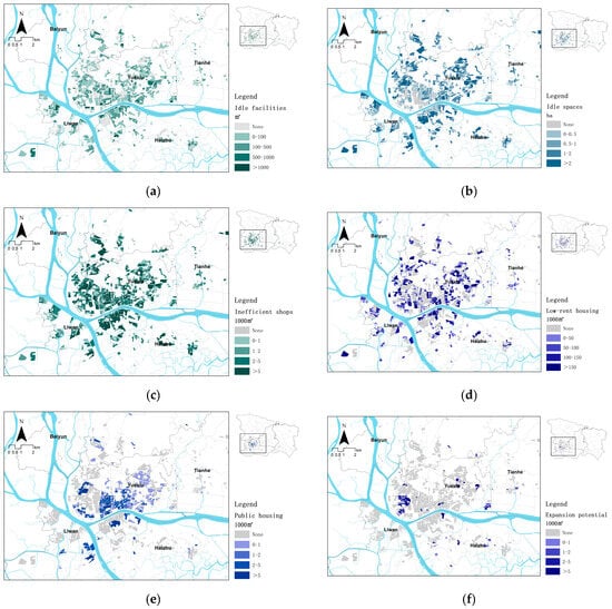 Spatial assets in old communities of central Guangzhou. (a) Idle facilities; (b) idle spaces; (c) inefficient shops; (d) low-rent housing; (e) public housing; (f) housing expansion potential.