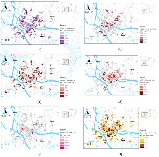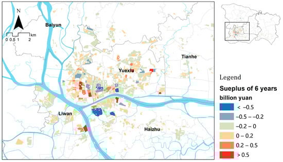 For a single community, the surplus is calculated as the revenue minus the cost. Revenue includes income generated from the five types of spatial assets, while the cost encompasses the investment required for the regeneration of various old residential areas (Equation (12)).