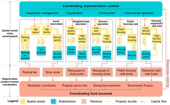 This study highlights that a coordinated arrangement at the area level is key to the sustainable regeneration of old communities. However, challenges remain in managing scattered spatial assets and complex revenue relationships, which hinder the effective use of various assets and the coordination of project benefits. The Community Land Trust system, used in the U.S. and U.K. [,], offers a useful reference by entrusting third-party enterprises to oversee the reconstruction, operation and management of community assets. For Guangzhou, it is recommended to establish “coordinating implementation entities” and “coordinating fund accounts” at the sub-district level to enhance the asset value and balance costs and revenues through better asset management and capital flow (Figure 10).