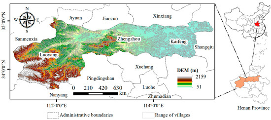 Zheng–Bian–Luo region encompasses the three cities of Zhengzhou, Luoyang, and Kaifeng. Luoyang, Zhengzhou, and Kaifeng are situated in the western, central, and eastern parts of Henan Province, respectively, including the entire province. The region, located in the middle and lower reaches of the Yellow River, comprises mountainous and hilly areas to the west and north of Luoyang and the border area between Zhengzhou and Luoyang, with predominantly flat areas elsewhere. The average annual precipitation is approximately 600 mm, which is suitable for various crops. It shares borders with Shangqiu to the east and Nanyang, Pingdingshan, Xuchang, and Zhoukou to the south. To the west, it is bordered by Sanmenxia, and across the Yellow River, it is connected to Jiyuan, Xinxiang, and Jiaozuo to the north. The region spans about 367 km from east to west and 182 km from north to south, with a total area of approximately 29,018 km2 (Figure 1).