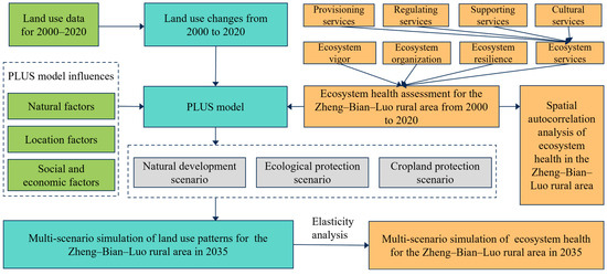 The Zheng–Bian–Luo area, situated in central China and spanning the entire Henan Province, possesses a complex terrain and stands as one of the most economically developed regions in the province. The region makes significant contributions to grain production and plays a crucial role in ensuring national food security. However, the cultivated land, wetlands, and nature reserves within the Yellow River embankment of Zheng–Bian–Luo area overlap, leading to conflicts between land use and ecological protection. Furthermore, affected by factors such as regional population growth, urbanization, and economic development, the ecological environment and land use in the Zheng–Bian–Luo villages have undergone significant changes. For instance, the rapid advancement of urbanization has resulted in the contraction of rural areas surrounding cities. The rising demand for agricultural irrigation and industrial water has contributed to a depletion of water resources. Rural areas are confronted with various challenges regarding ecosystem health, and it is crucial to clarify the effects of land use change on ecosystem health. There are notable disparities in the levels of rural economic development and ecological conditions within the region. Consequently, the selection of the Zheng–Bian–Luo rural areas is both comprehensive and representative. This study analyzes the spatiotemporal patterns of ecosystem health in the Zheng–Bian–Luo rural area from 2000 to 2020, utilizing villages as the fundamental evaluation units. By collecting and integrating data from multiple sources regarding land use, socio-economics, and other factors, the study aims to uncover the spatial differentiation characteristics and temporal evolution trends of ecosystem health in the Zheng–Bian–Luo rural area. Furthermore, it evaluates the level of ecosystem health and simulates the development of rural ecosystem health under different scenarios. The findings are expected to advance regional integration, guide rural policy-making in Henan Province, and contribute to rural revitalization.