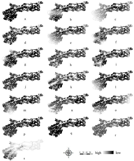 Influence factor of PLUS model selection. Note: (a) GDP; (b) Distance to national road; (c) Distance to provincial government; (d) Distance to provincial road; (e) Distance to municipal government; (f) Distance to county government; (g) Distance to county road; (h) Distance to township government; (i) Distance to township road; (j) Distance to village settlements; (k) Distance to water bodies; (l) Distance to highway; (m) Distance to railway; (n) DEM; (o) Annual average rainfall; (p) Slope; (q) Population density; (r) Aspect; (s) Annual average temperature.