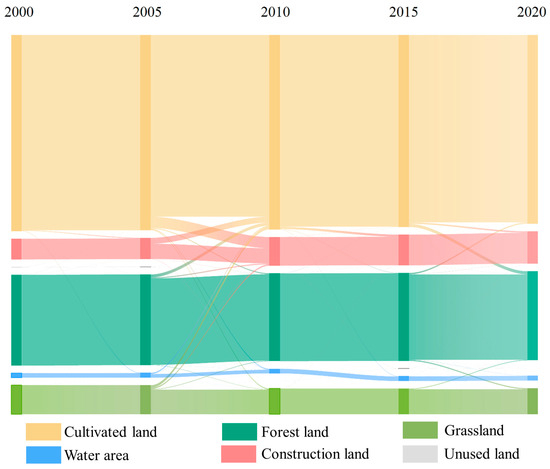 From 2000 to 2020, the transition area among six types of land use in rural regions of Zheng–Bian–Luo was approximately 2293.37 km2, accounting for 11.82% of the total area. Specifically, there was minimal land use transfer from 2000 to 2005 and 2010 to 2015, with only minor conversions from cultivated land to construction land in 2000. However, significant increases in land use transfers were observed from 2005 to 2010, with the largest mutual transfers occurring between cultivated land and construction land. Forest land, grassland, and water bodies were predominantly converted to cultivated land, with smaller portions converted to construction land and some cultivated land reverting back to forest land, water bodies, and grassland. From 2015 to 2020, cultivated land was mainly converted to forest land, with a smaller proportion converting to construction land, while forest land underwent equal conversions to cultivated land and grassland (Figure 5).
