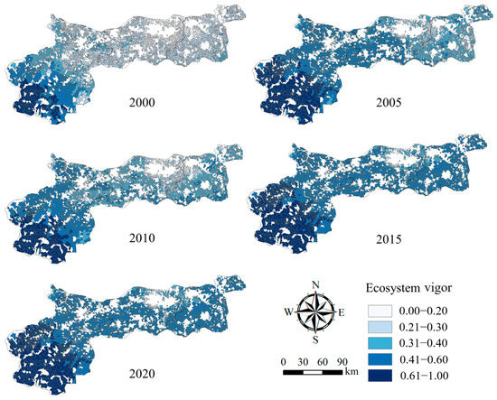 To effectively illustrate the evolution of ecosystem health over time in the rural Zheng–Bian–Luo area, we have classified the ecosystem health index into five levels using the natural breaks method: poor (0–0.20), relatively poor (0.20–0.30), average (0.30–0.35), relatively good (0.35–0.50), and excellent (0.50–1.00).